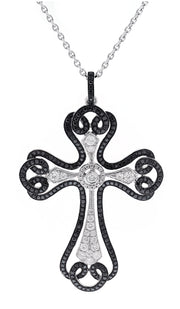 18kt white gold micro pave set round brilliant and black diamond cross pendant with a white gold cable link chain