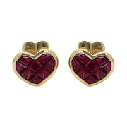 18kt yellow gold invisible set princess cut ruby heart shaped studs.