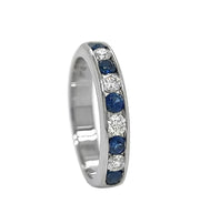 Platinum channel set round brilliant diamond and blue sapphire band.
