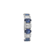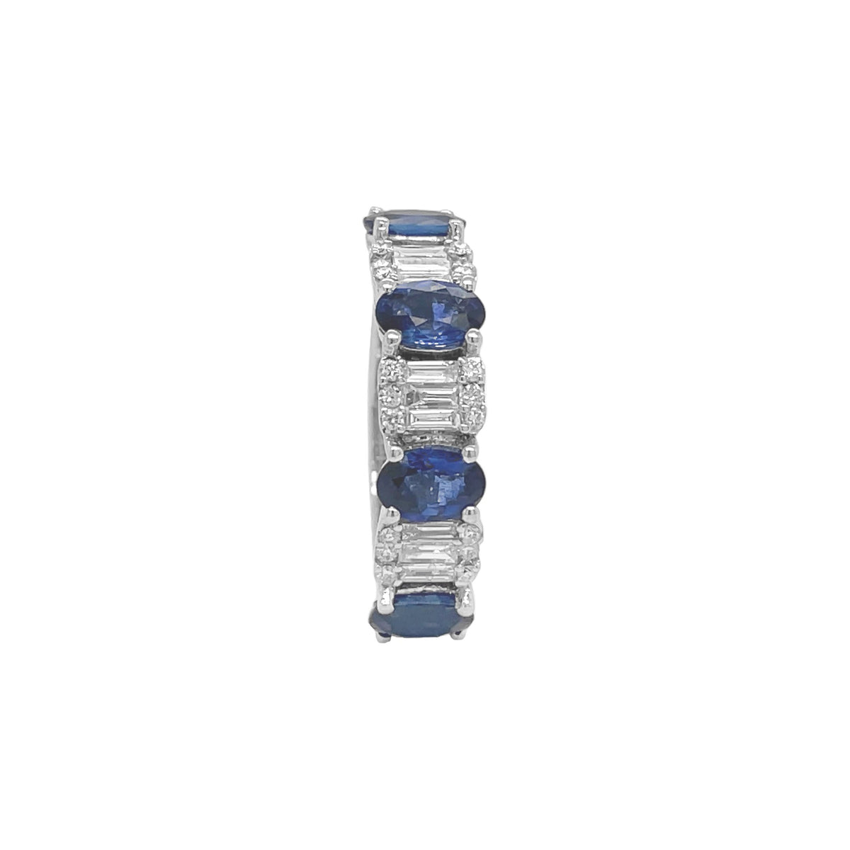 18kt white gold 4 prong set blue sapphire and micro prong set baguette and round brilliant diamond multi-cluster band.