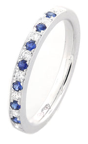 18kt white gold micro pave set round brilliant diamond and sapphire band with millgrain etching