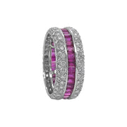 18KT white gold micro pave set round brilliant diamond and channel set ruby band
