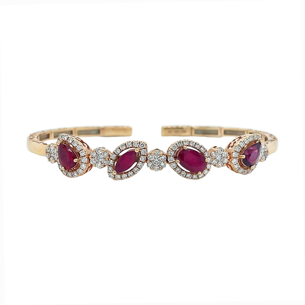 18kt rose gold micro prong set round brilliant diamond and ruby bangle with different shape clusters.