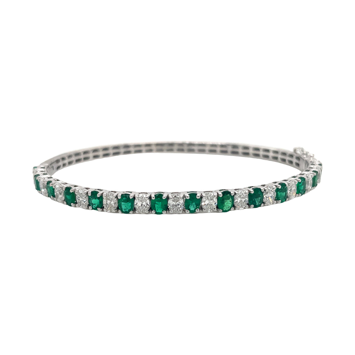 18kt white gold 4 prong set oval diamond and green emerald bangle.