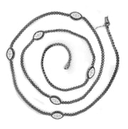 18kt black gold micro prong set black and white round diamond pear shape multi-cluster long necklace.