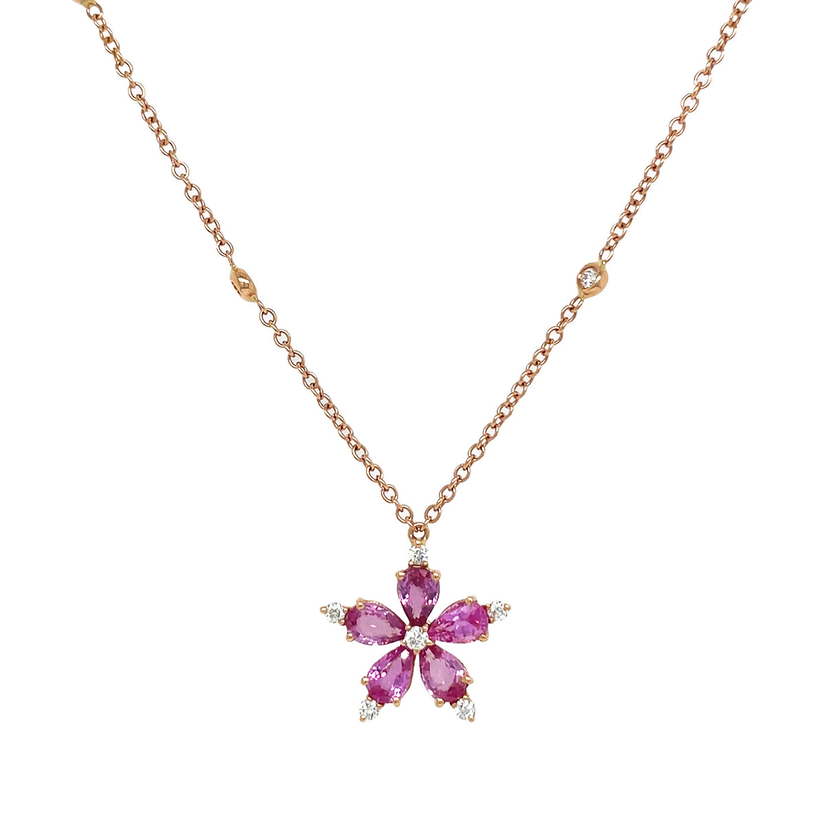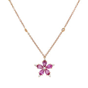 18kt Rose gold prong set round brilliant diamond and pink sapphire flower pendant.