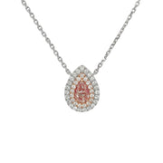 18kt white and rose gold 3 prong set pear shaped pink diamond pendant with micro prong set round brilliant diamond double halo.