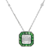 18kt white gold invisible set baguette and round brilliant diamond cluster pendant with green emerald halo.