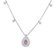18kt white gold 3 prong set pink sapphire and micro prong set round brilliant diamond tear drop pendant.