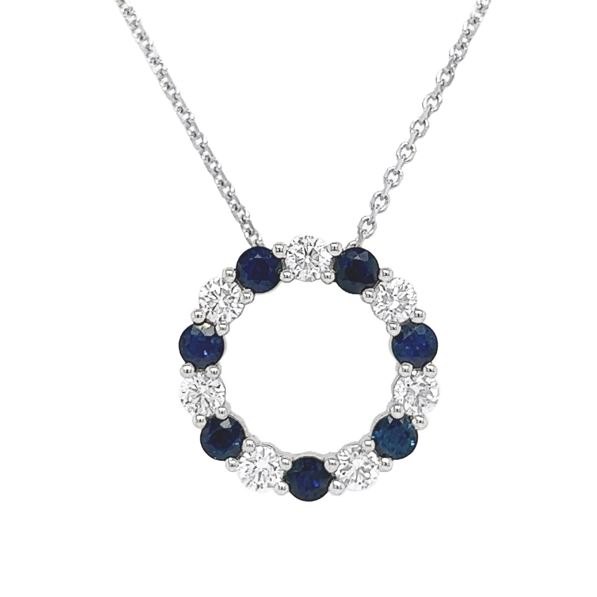 18kt white gold mutual prong blue sapphire and round brilliant diamond circle pendant with 14kt white gold cable link chain.