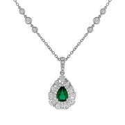 18kt white gold 3 prong set green stone pendant with prong set pear, baguette and round brilliant diamond halo.
