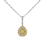 18kt white gold prong set yellow diamond and round brilliant diamond tear drop pendant.