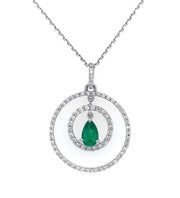 18kt White gold pear shape emeral stone set into center with micro pave set round brilliant diamond pendant