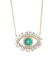 18kt yellow gold 4 prong set green emerald and micro prong set baguette and round brilliant diamond evil eye pendant.