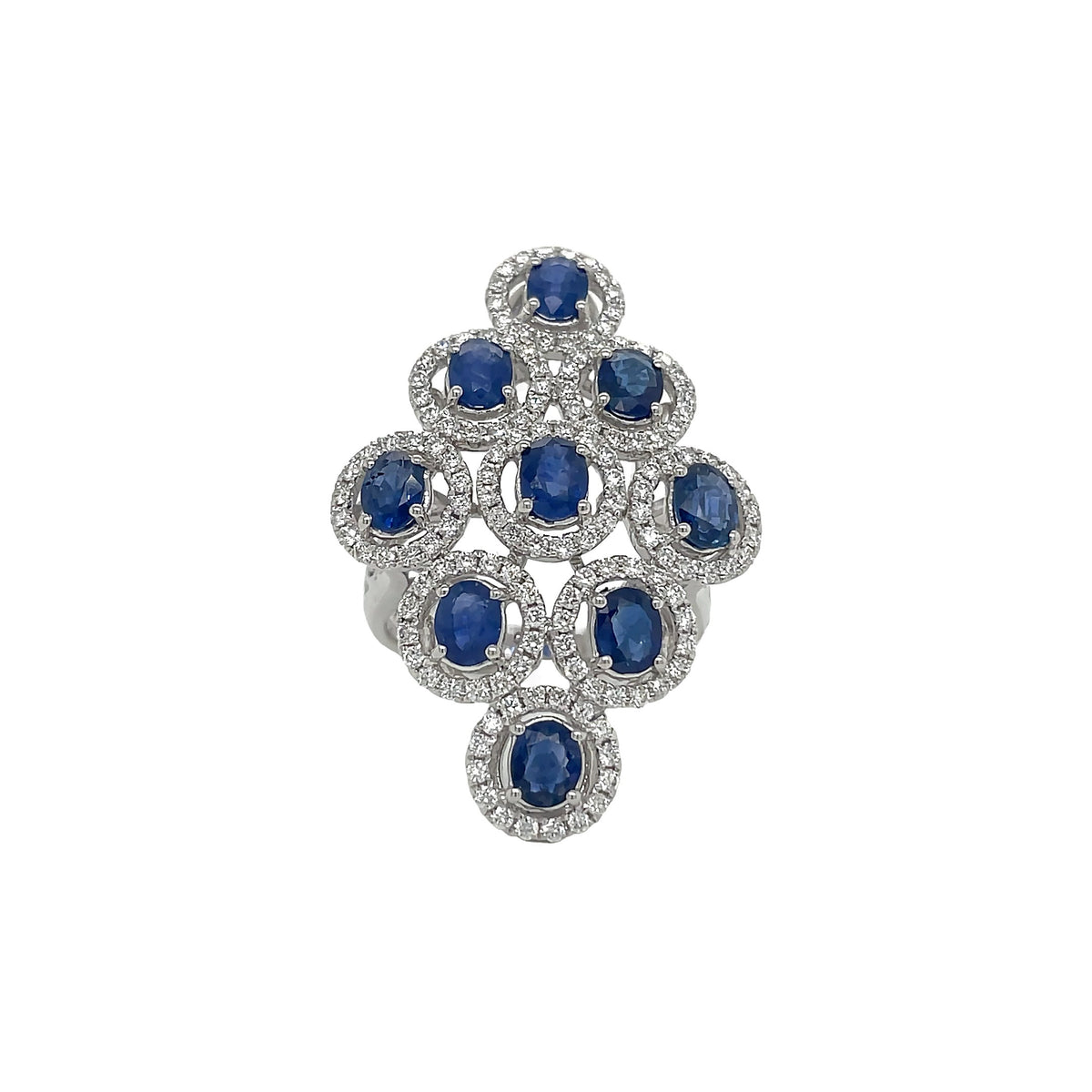 18kt white gold micro prong set round brilliant diamond and 4 prong set blue sapphire ring.