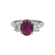 Platinum 4 prong set GIA certified ruby and oval diamond 3-stone ring.