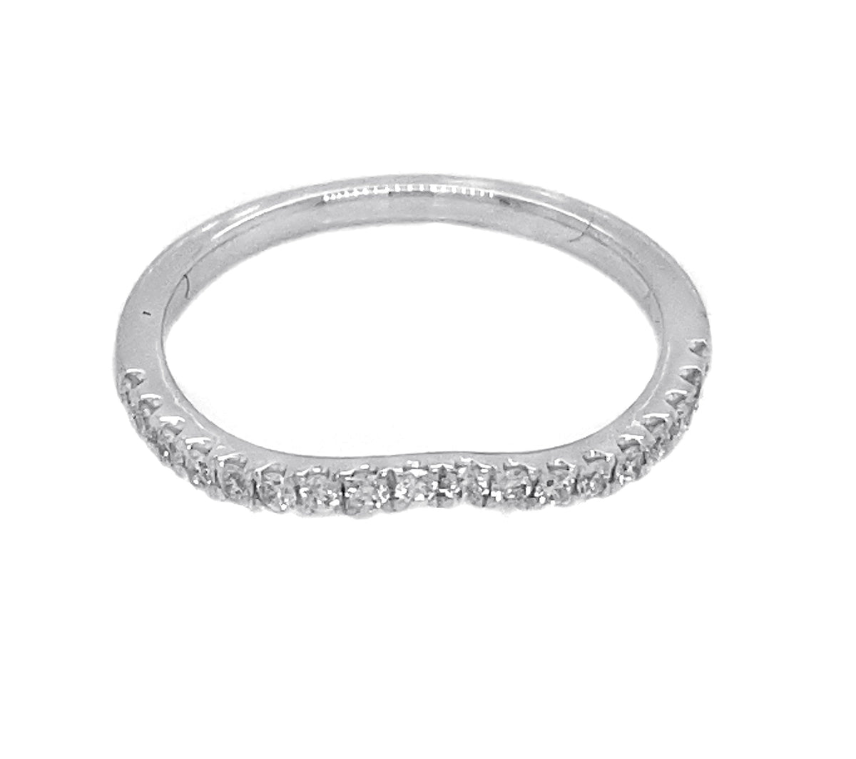 18kt white gold micro prong set round brilliant diamond curve band.