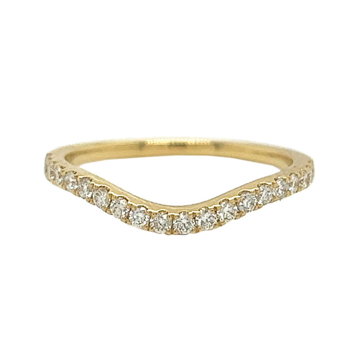 18kt yellow gold micro prong set round brilliant diamond curve band.