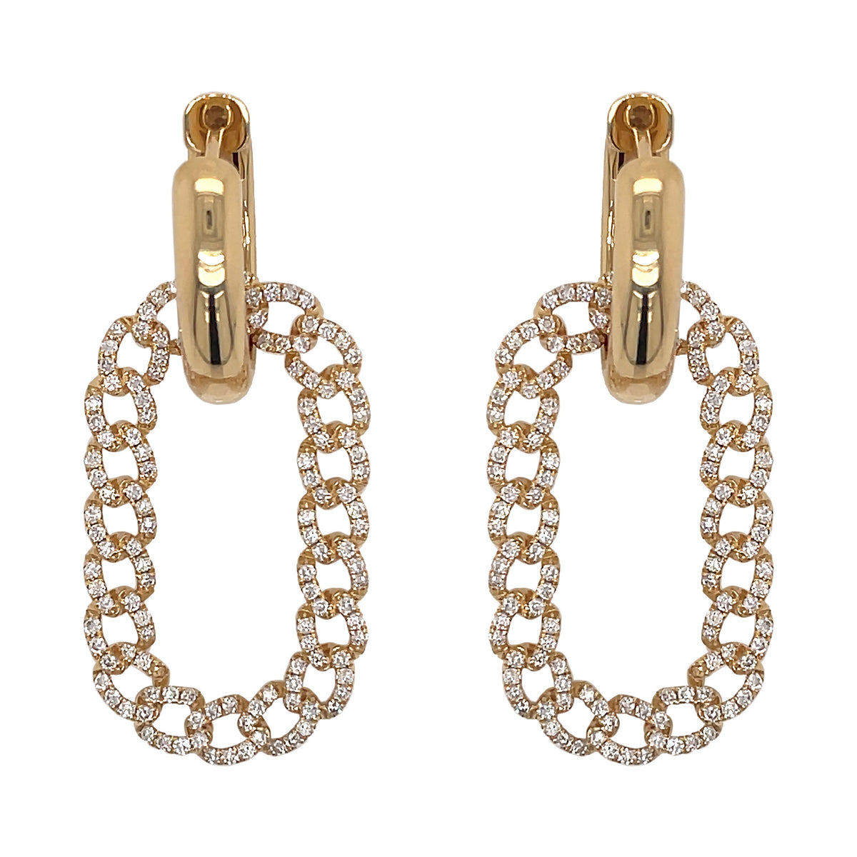 18kt yellow gold micro prong set round brilliant diamond link earrings.