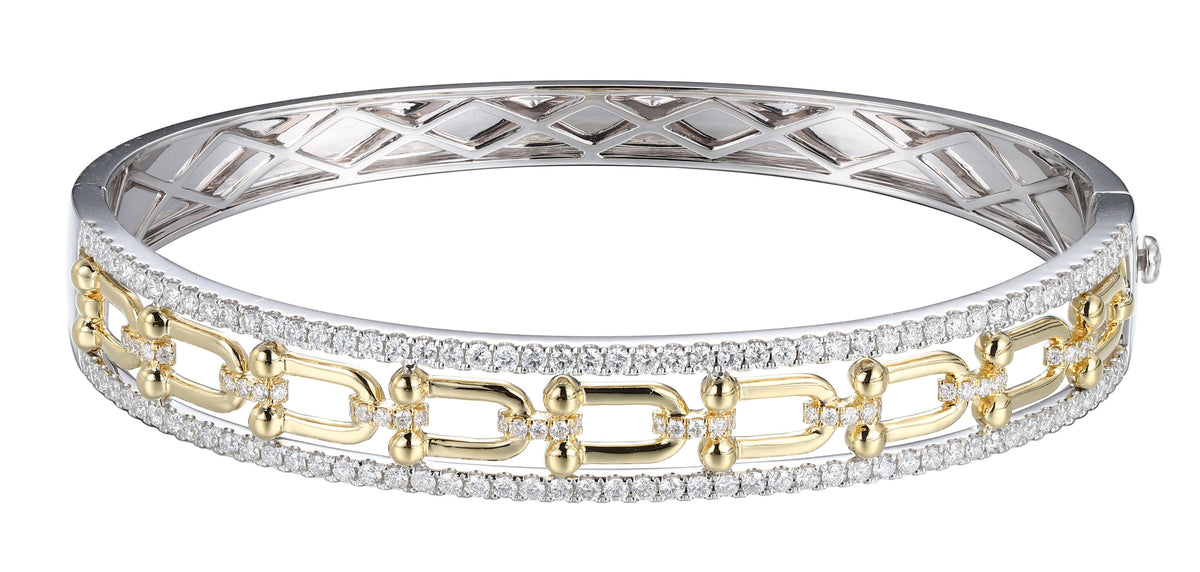 18kt white and yellow gold micro pave set round brilliant diamond link design bangle.