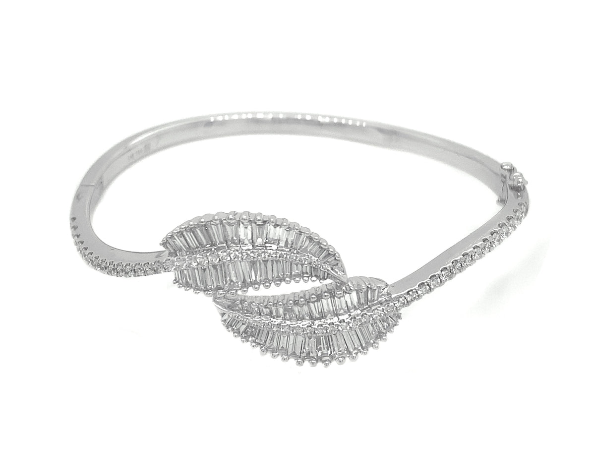 18kt white gold micro prong set round brilliant diamond and prong set baguette diamond double feather bangle.