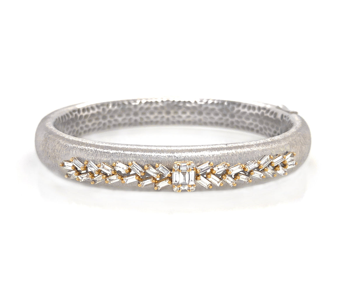 18kt white and yellow gold prong set baguette and round brilliant diamond mesh finish bangle.