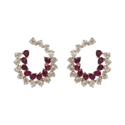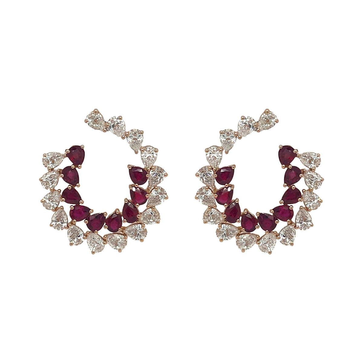 18kt rose gold 3 prong set pear shaped diamond and ruby swirl earrings.
