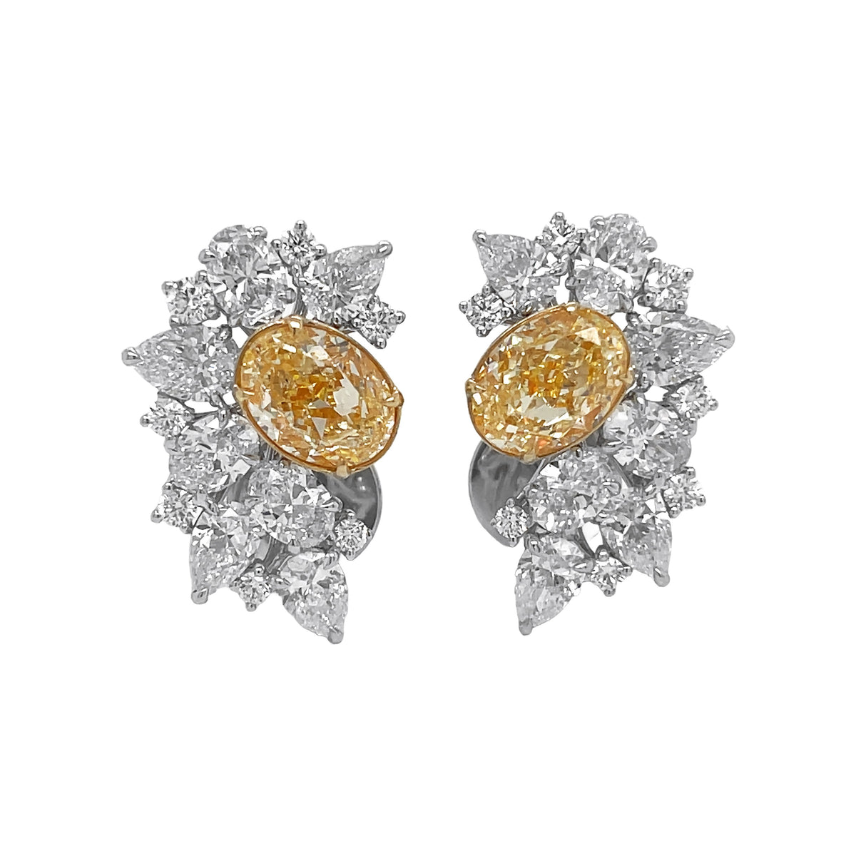 18kt white and yellow gold 4 prong set oval shaped yellow diamond and prong set marquise, pear and round brilliant diamond cluster earrings.