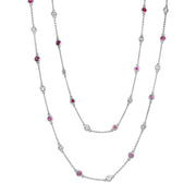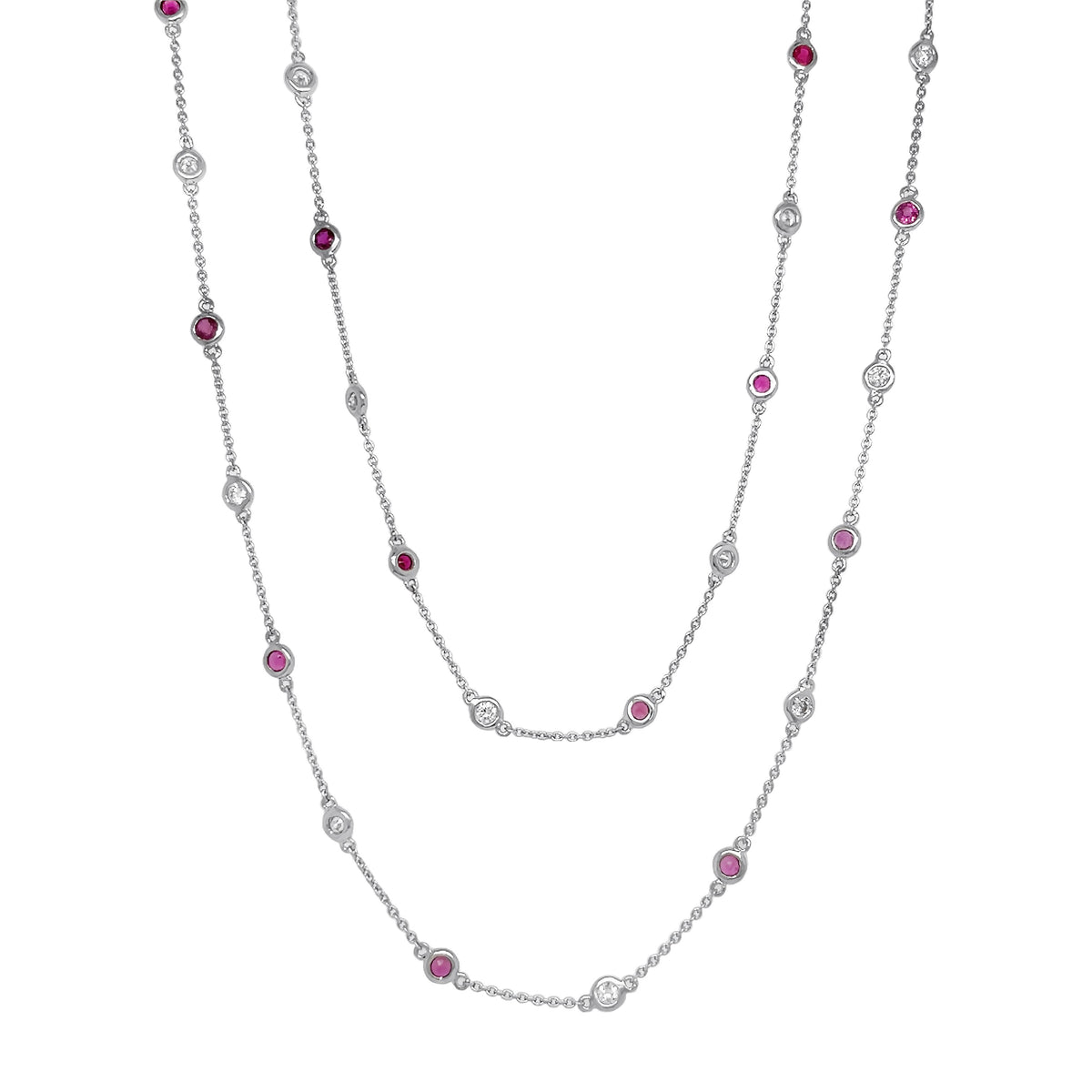 14kt white gold bezel set round brilliant diamond and ruby, diamonds-by-the-inch necklace.
