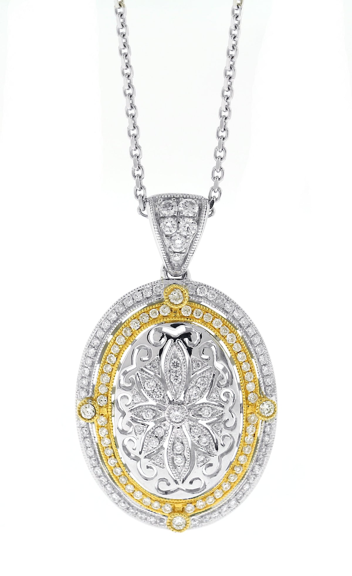 18kt white and yellow gold micro pave and bezel set round brilliant diamond oval shape pendant with milgrain finish.