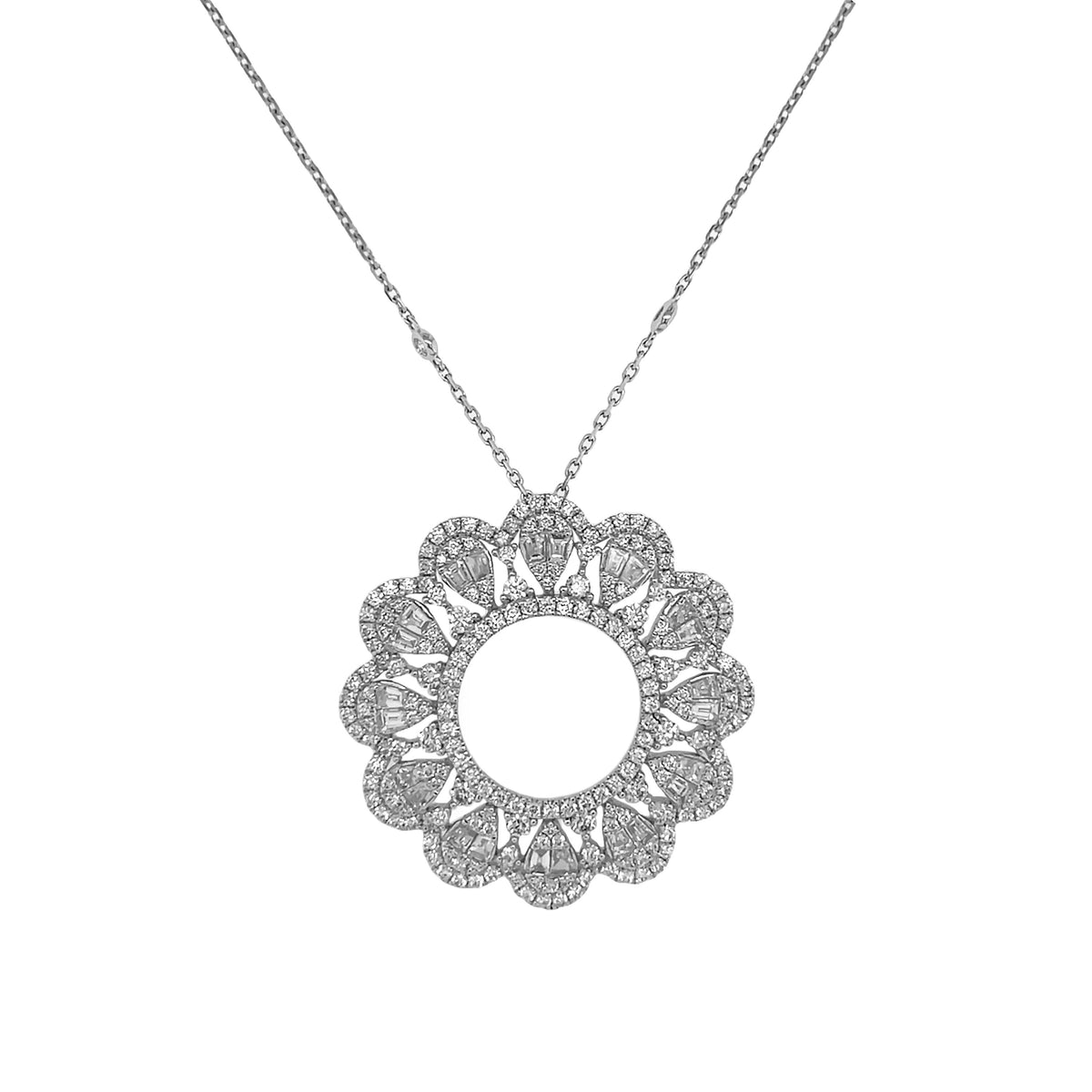 18kt white gold micro prong set baguette and round brilliant diamond circle pendant.