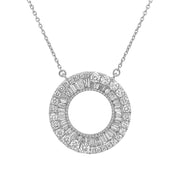 18kt white gold micro prong set round brilliant diamond and channel set baguette diamond circle pendant.