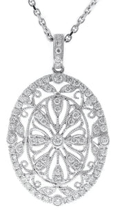 18kt white gold micro prong and bezel set round brilliant diamond webed oval pendant with milgrain