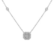 18kt white gold 4 prong set asscher cut diamond pendant with micro prong set round brilliant diamond halo.
