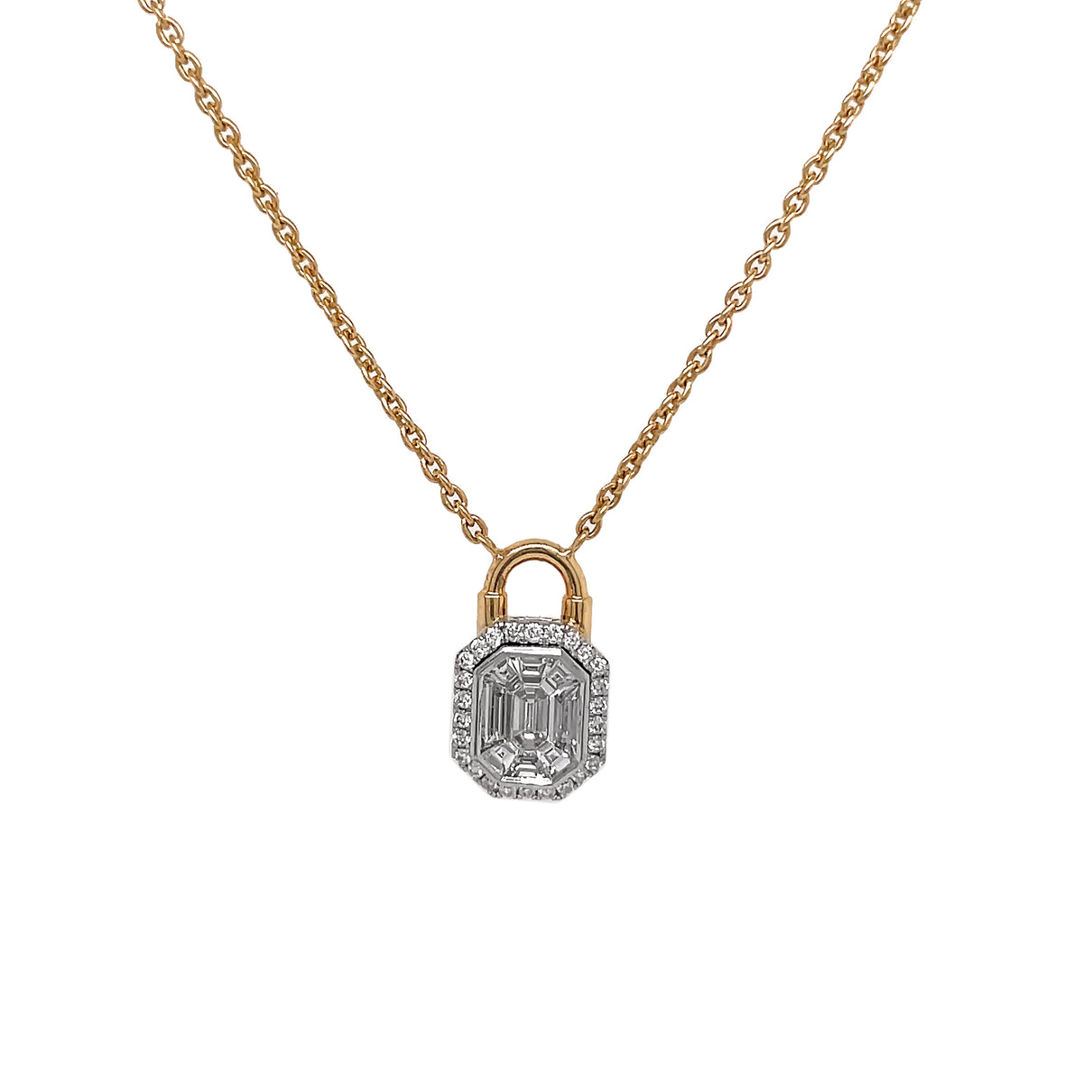 18kt yellow and white gold invisible set emerald and micro prong set round brilliant diamond pendant.
