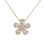 18kt yellow gold micro prong set baguette and round brilliant diamond flower pendant.