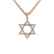 18kt yellow gold channel set baguette and micro prong set round brilliant diamond star of david pendant.