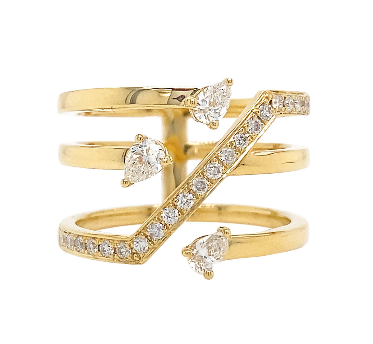 18kt yellow gold micro pave set round brilliant diamond and 3 prong set pear diamond criss-cross ring.