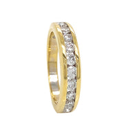 18kt yellow gold channel set round brilliant diamond half-way band.