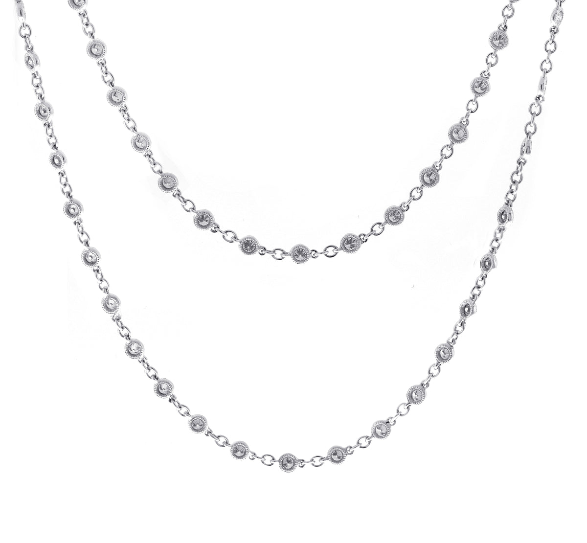 18kt white gold bezel set round brilliant diamond with milgrain finish diamond by the yard necklace.(diamonds are near to each other)