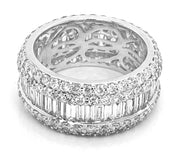 18kt white gold micro prong set round brilliant diamond and channel set baguette diamond wide eternity band.