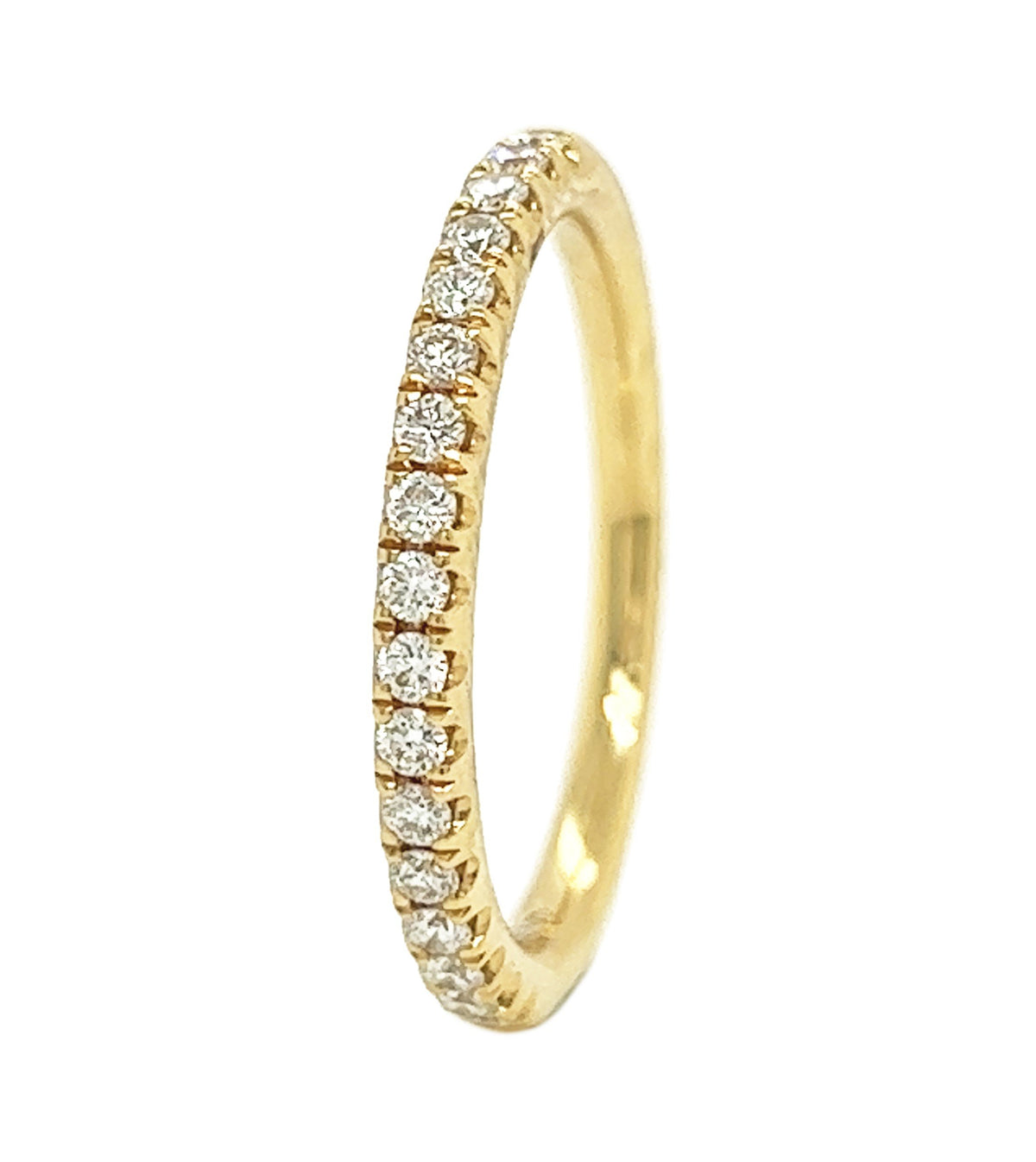 18kt yellow gold micro prong set round brilliant diamond eternity band.