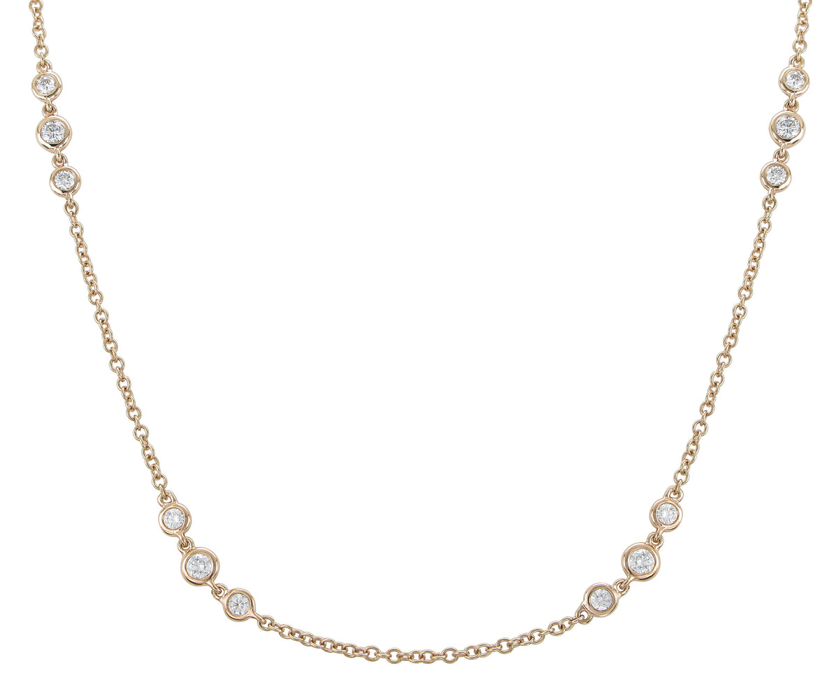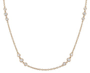 18kt rose gold bezel set round brilliant diamond, diamonds-by-the-inch 3-stone design necklace.