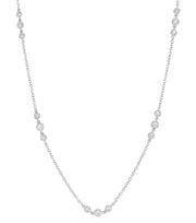 18kt white gold bezel set round brilliant diamond, 3-stone design diamonds-by-the-inch necklace with milgrain finish.