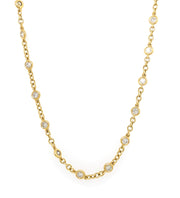 18kt yellow gold invisible set emerald cut diamond pendant with bezel set round brilliant diamond, diamonds-by-the-inch chain.