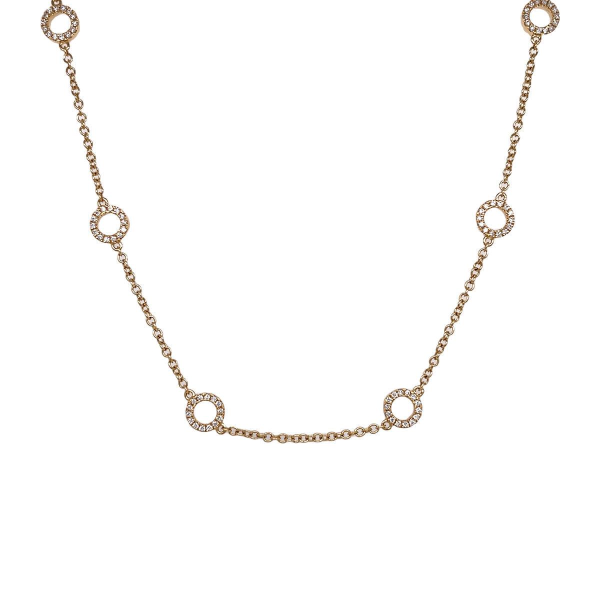 18kt yellow gold micro prong set round brilliant diamond multi-cluster circle necklace.