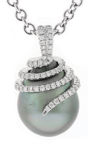18kt white gold micro prong set round brilliant diamond tear drop black south sea pearl pendant with 14kt white gold cable link chain 16"