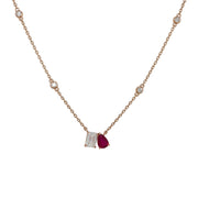 18kt rose gold prong set ruby and emerald cut diamond pendant with bezel set round brilliant diamond, diamonds-by-the-inch chain.