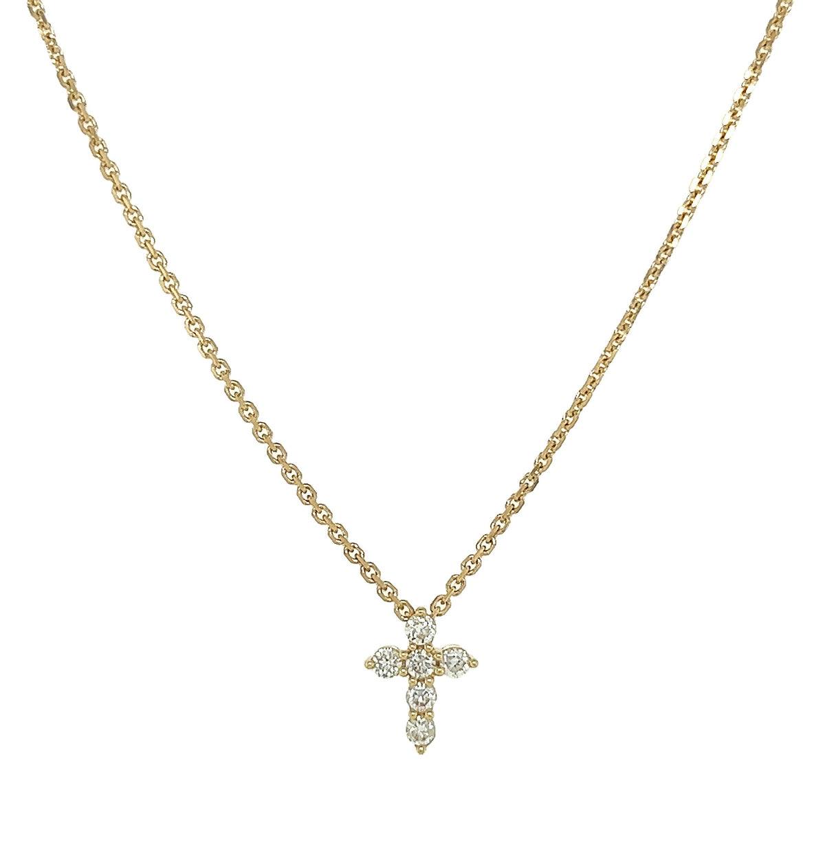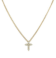 18kt yellow gold mutual prong set round brilliant diamond cross pendant.