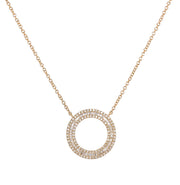 18kt yellow gold channel set baguette and micro prong set round brilliant diamond circle pendant.